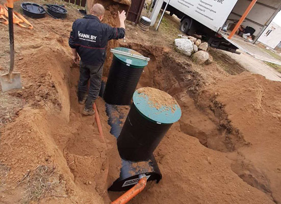 Наша компания монтирует современные септики KANN®. Подобные системы позволяет очистить канализационные стоки до уровня технической прозрачной воды без запаха (очистка до 98%). Далее техническая вода отводится в грунт. Нерастворимый мусор, переработанные остатки ила, пищевых отходов хранятся в станции, и удаляются обычно один раз в год.